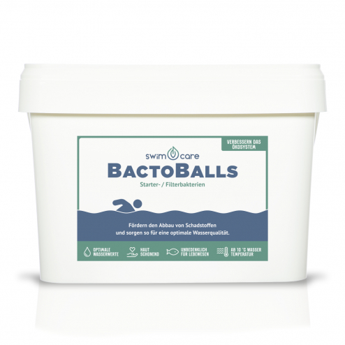 swimcare® BactoBalls verbessert das ökologische Gleichgewicht im künstlichen Teich. Die kleinen Gel-Bälle reifen über einen langen Zeitraum in einer Nährflüssigkeit und nehmen dabei Milliarden von nützlichen Mikroorganismen auf. Nach dem Einbringen in den Filter geben sie die Mikroorganismen langsam und gleichmäßig ab und sorgen so für eine stetige und wohldosierte Bakterienpopulation im Filter und im Teich. Im Gegensatz zu anderen, meist flüssigen Produkten, bleiben die Bakterien dort, wo sie benötigt werden: im Filter.