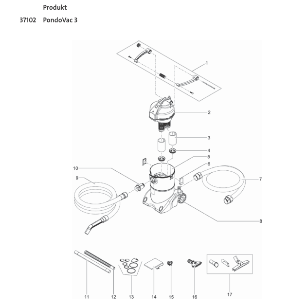 Auf dieser Ersatzteil-Übersichtsseiten listen wir Ihnen alle Ersatzteile, die für Ersatzteile für PondoVac 3 mit der Artikelnummer: 37102 erhältlich sind, auf. Die Explosionszeichnungen zeigt Ihnen den Einbauort jedes einzelnen Ersatzteils. Vergleichen Sie dafür die Positionsnummer mit der Nummer im Bild des Ersatzteils. Die verwendete Stückzahl des Ersatzteils für Ersatzteile für PondoVac 3, ist am Warenkorbbutton bereits für Sie vordefiniert.