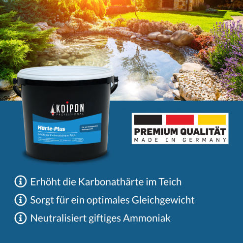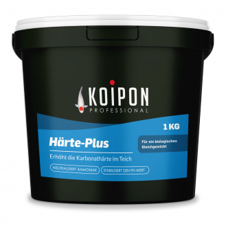 KOIPON® Härte-Plus sorgt für eine schnelle Erhöhung der Karbonathärte. Im Teich sollte die Karbonathärte (KH) zwischen 5 °dH und 10 °dH liegen, das sorgt für stabilere pH-Werte. Wenn weniger Karbonathärte vorhanden ist, schwankt der pH-Wert innerhalb von 24 Stunden zu stark. Dadurch erhöht sich der für die Fische giftige Ammoniakgehalt im Teich. Ab einem pH-Wert über 8,5 wird es für die Fische lebensbedrohlich. Je höher der pH-Wert, desto mehr Ammoniak. Mit Härte-Plus können Sie eine schnelle Absenkung bei gefährlichen pH-Werten über 8,5 erreichen.