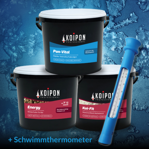 Sparen Sie mit unserem KOIPON Winterpaket und bringen Sie Ihren Teich und seine Bewohner gesund und stabil durch die kalte Jahreszeit. Zusätzlich schenken wir Ihnen mit dem Kauf des Paketes ein Schwimmthermometer. In dem Winterpaket sind folgende KOIPON Artikel enthalten: