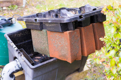 Haben Sie schon einmal darüber nachgedacht, Ihren Filter über Nacht auszuschalten? Bitte nicht! Wird der Filter ausgestellt oder durch einen Stromausfall stillgelegt, sinkt innerhalb kürzester Zeit der Sauerstoffgehalt dramatisch ab. Die Folge? Wichtige Bakterien sterben ab und produzieren giftige Stoffwechselprodukte wie zum Beispiel Schwefelwasserstoff. Geht der Filter nun ohne eine Reinigung in den Betrieb, wird ein gefährliches Gemisch aus Giftstoffen und toten Bakterien direkt in den Teich und somit zu Ihren Koi gespült. Ein weiterer Nachteil ist, dass es viele Wochen dauert, bevor die ökologische Besiedelung wieder vollständig hergestellt ist. Auch im Winter sollten der Filter möglichst weiterlaufen. Möchten Sie ihn dennoch außer Betrieb nehmen, sollten Sie die Filterschwämme in den Teich hängen. Im Frühjahr können Sie die Besiedelung der Filterschwämme mit Starter- bzw. Filterbakterien unterstützen..
