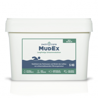 swimcare® MudEx ist eine mineralische Komposition, die den Aufbau von schlammabbauenden Mikroorganismen fördert. Teichschlamm und abgestorbene Algen werden innerhalb weniger Wochen deutlich reduziert. Die Wasserqualität wird durch MudEx langfristig verbessert und das ökologische Gleichgewicht im Schwimmteich gefördert. Gleichzeitig stabilisieren sich Karbonathärte und pH-Wert. Bei regelmäßiger, monatlicher Anwendung wird die biologische Selbstreinigungskraft gefördert und die Filterbelastung im Schwimmteich wird reduziert. MudEx ist ein 100% natürliches Pflegeprodukt, sehr hautschonend und vollkommen unbedenklich für alle Teichbewohner.