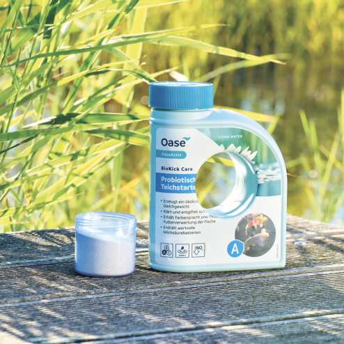 Mit dem biologischen Wasserreiniger BioKick Care werden dem Teichwasser eine Vielzahl nützlicher Mikroorganismen zugefügt, dadurch werden organische Ablagerungen, sowie kritische Nährstoffe wie Ammonium oder Nitrit effektiv abgebaut. Milchsäurebakterien und wichtige Mineralstoffe fördern das Wohlbefinden und bringen so die Farbenpracht der Koi zu vollem Glanz. Durch den biologischen Abbau von Biomasse werden die Reinigungsintervalle bei Filteranlagen deutlich verlängert und so die so wichtige Standzeit verlängert.