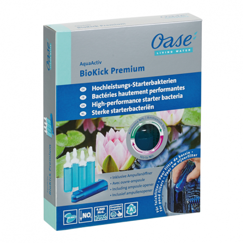 Anwendung: Die Filterbakterien können ab einer Wassertemperatur von 8 °C angewendet werden. Öffnen Sie die entsprechende Anzahl an Ampullen mit dem beiliegenden Ampullenöffner. Geben Sie die Flüssigkeit direkt auf die Filterschwämme oder in die im Teichfilter eventuell vorhandene Einfüllkammer. Ihr Teichfilter kann währenddessen im normalen Betrieb weiterlaufen.