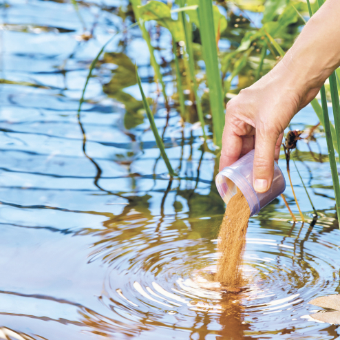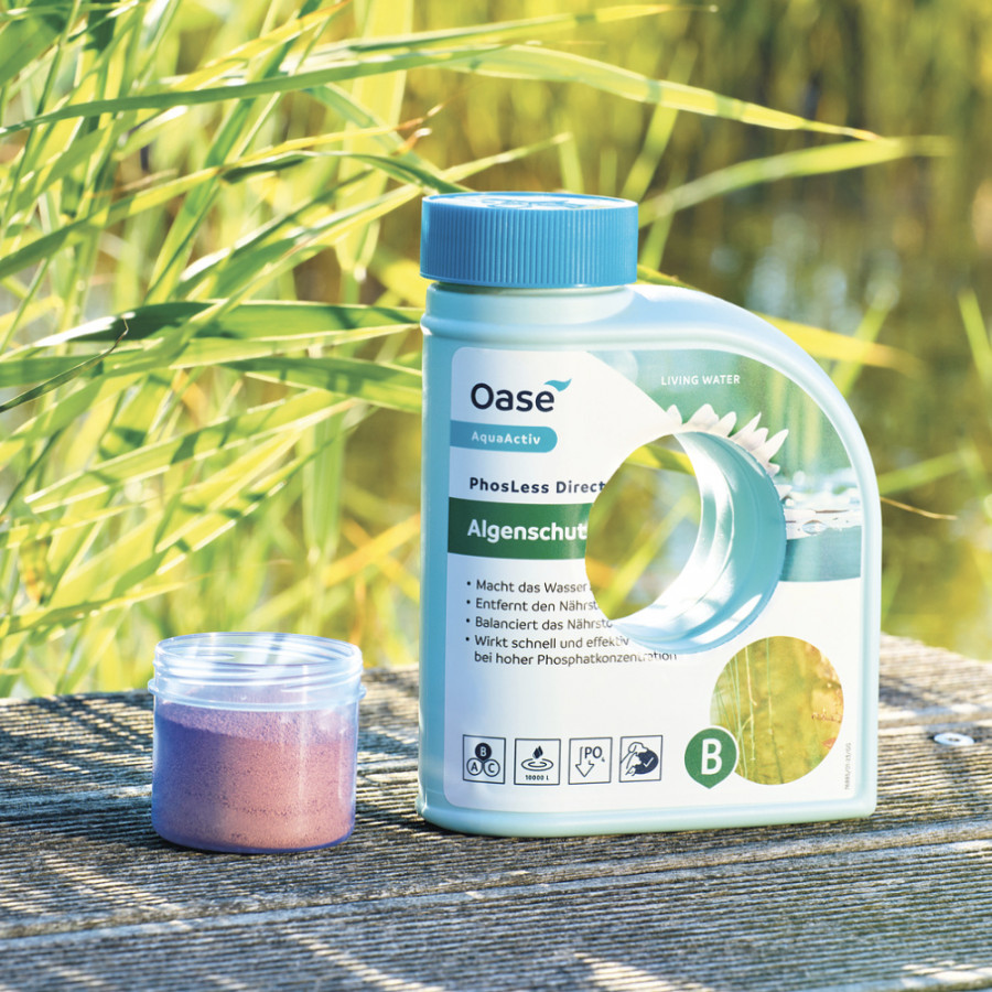 Phosphate kommen in Gartenteichen in vergleichsweise geringen Mengen vor, sind aber eine essentielle Nährstoff quelle für Algen und schädliche Bakterien. PhosLess Direct entzieht dem Wasser auf physikalischem Wege das Phosphat, so dass Algenplagen wirksam vorgebeugt werden kann. Es bietet dabei schnelle Hilfe bei akut erhöhten Phosphatwerten oder unmittelbar nach Algenbehandlungen und senkt den Gehalt unter die für das Algenwachstum erforderliche Grenze von 0,035 mg/l. Ideal angewendet wird es bereits im zeitigen Frühjahr, um Algenplagen während der Teichsaison vorzubeugen.