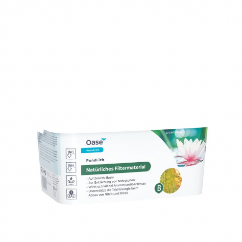 Oase AquaActiv PondLith ist ein Filtermaterial auf Zeolith-Basis. Zeolith ist eine natürliche Gesteinsart mit einer etwa 1000-mal größeren kristallinen Oberfläche als Sand oder Kies und dadurch als Filtermaterial ideal geeignet. Oase AquaActiv PondLith hat eine Körnungsgröße von 5 bis 10 mm. Auf der großen Oberfläche siedeln sich Mikroorganismen an, die überschüssige Nährstoffe binden und abbauen. Dadurch wird auf natürliche Weise die Wasserqualität verbessert und dem Wachstum von Grünalgen sowie einer Wassertrübung entgegengewirkt. Das hochwertige Filtermaterial gibt es im praktischen Filterkorb (20 x 20 x 12 cm) mit 2,5 kg Inhalt ausreichend für 2500 l Wasser. Der Filterkorb mit dem Filtermaterial wird einfach nur ins Wasser oder das Filtersystem gelegt. Die Wirkungsdauer nach erstmaligem Einsatz beträgt 125 Tage.
