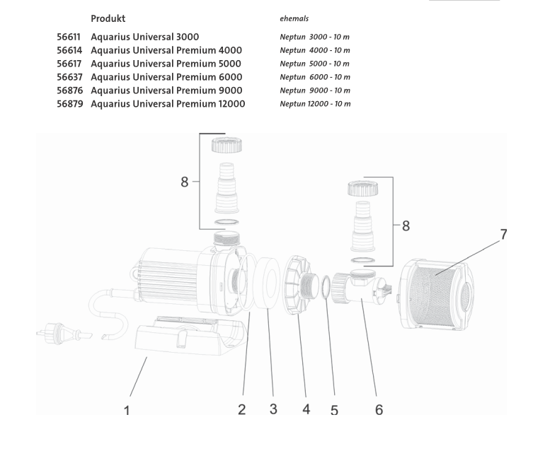 Auf dieser Ersatzteil-Übersichtsseiten listen wir Ihnen alle Ersatzteile, die für Ersatzteile für Oase Aquarius Universal 3000 mit der Artikelnummer: 56611 erhältlich sind, auf. Die Explosionszeichnungen zeigt Ihnen den Einbauort jedes einzelnen Ersatzteils. Vergleichen Sie dafür die Positionsnummer mit der Nummer im Bild des Ersatzteils. Die verwendete Stückzahl des Ersatzteils für Ersatzteile für Oase Aquarius Universal 3000, ist am Warenkorbbutton bereits für Sie vordefiniert.