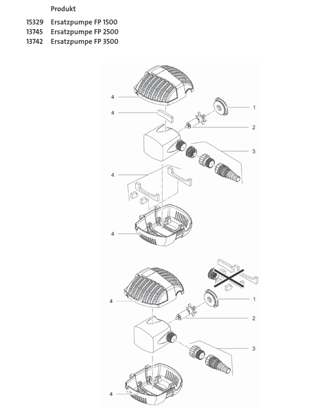 Auf dieser Ersatzteil-Übersichtsseiten listen wir Ihnen alle Ersatzteile, die für Ersatzteile für Oase Ersatzpumpe FP 3500 mit der Artikelnummer: 13742 erhältlich sind, auf. Die Explosionszeichnungen zeigt Ihnen den Einbauort jedes einzelnen Ersatzteils. Vergleichen Sie dafür die Positionsnummer mit der Nummer im Bild des Ersatzteils. Die verwendete Stückzahl des Ersatzteils für Ersatzteile für Oase Ersatzpumpe FP 3500, ist am Warenkorbbutton bereits für Sie vordefiniert.