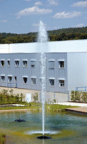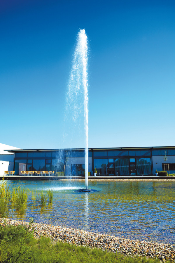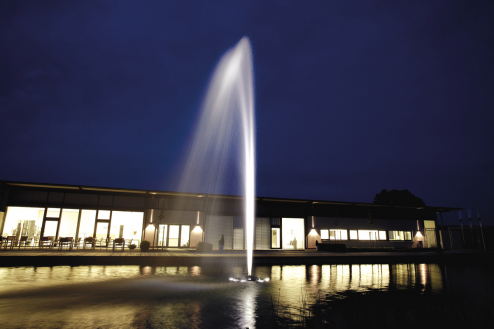 Der Oase Geyser Jet 30 Fontänenaufsatz erzeugt mehrere vertikale Einzelstrahlen, welche zu einem breiten Wasserstrahl zusammengefasst werden.