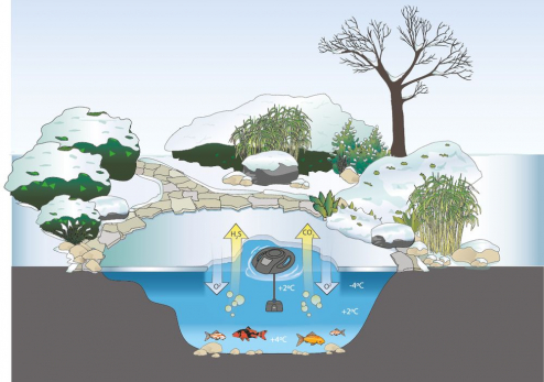 Der Oase IceFree 4 Seasons vereint Eisfreihalter und Wasserspiel in einem Gerät. Die Pumpe fördert wärmeres Tiefenwasser an die Oberfläche und hält einen kleinen Bereich eisfrei. So können schädliche Gase entweichen und Sauerstoff kann in den Teich gelangen. Mit dem Düsenaufsatz wird im Sommer ein ansehnliches Wasserspiel erzeugt. Die Oberflächenbewegung trägt überlebenswichtigen Sauerstoff ein. Bis zu - 20 °C wird ein eisfreier bereich um den Schwimmkörper erzeugt. Energieeffiziente Pumpentechnick ohne zusätzliches Heizelement (erfordert Tiefe von min. 80 cm).