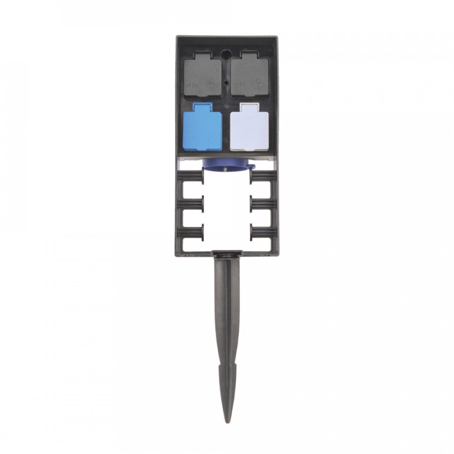 Gartensteckdose mit Abdeckung und Fernbedienung. Reichweite im Freien max.50 m. 1x 230V Eingangsstecker, 1 Steckdose permanent, 1x Steckdose dimmbar 40-320W, 2x Steckdose ein/aus je max.2000W. Gesamtbelastung max.3600W/16A
