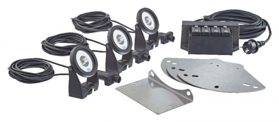 Setzen Sie Ihre Schwimmfontäne PondJet Eco, MIDI II, MAXI II oder AirFlo mit diesem Beleuchtungsset eindrucksvoll in Szene! Die 3 LunAqua Power LED Scheinwerfer sind mit den beigefügten Haltebügeln einfach zu montieren und beeindrucken trotz geringer Leistungsaufnahme von nur 5,8 W mit ihrer Helligkeit von 580 Lumen als einige der hellsten LED-Scheinwerfer in unserem Teichbeleuchtungssortiment. So hell wie eine 50 W Glühbirne! Die Farbtemperatur ist mit 2.700 K warmweiß und die Lebensdauer der LED-Leuchtmittel ist mit 36.000 Stunden äußerst lang. Dank der 24-V-DC-Niedervoltspannung an den Scheinwerfern besonders sicher. Die robuste Unterwasser-Verbindungstechnik mit einem 20 m langen Kabel besitzt Schutzklasse IP68 und ist für den dauerhaften Unterwasser-Einsatz geeignet. Sicher, zuverlässig und einfach zu montieren ist die Oase LED-Schwimmfontänenbeleuchtung ein echter Hingucker!