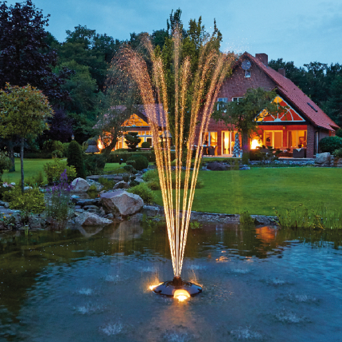 - Das Wasser schießt druckvoll in feinen Strahlen empor. Am Scheitelpunkt lösen sich die Strahlen in zarte Tropfen auf und regnen in filigranen Stufen herab.