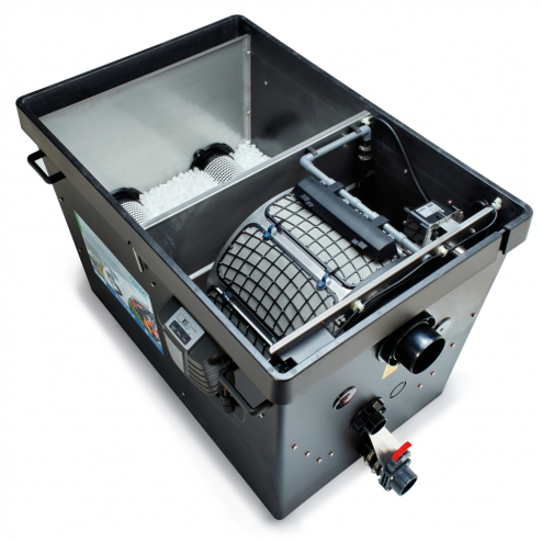 Dieser neuartige Kompakttrommelfilter der ProfiClear Premium Reihe ist die günstige Alternative für kleinere bis mittelgroße Gewässer ohne Fischbesatz bis 120 m³. Insbesondere für Koiteiche bis 30 m³ ist das kompakte Modulfiltersystem ideal. Führende Koiexperten wurden bei der Entwicklung der Reihe zurate gezogen. Im gepumpten Prinzip liegt der maximale Wasserdurchfluss des Filters bei 20.000 Liter pro Stunde. Bei dieser völlig selbstreinigenden Trommelfiltereinheit sorgt das Wirbelbettverfahren (Moving Bed System) für optimale Wasserbewegung und -reinigung. Dabei bewirken professionelle Hel-X-Biomedien den effektiven Abbau von Nähr- und Schadstoffen im Wasser. Für die hohe Abscheideleistung sorgen eine Tiefenfiltration von bis zu 60 Micron und ein neues Hel-X 13 Filtermedium mit deutlich vergrößerter Oberfläche.