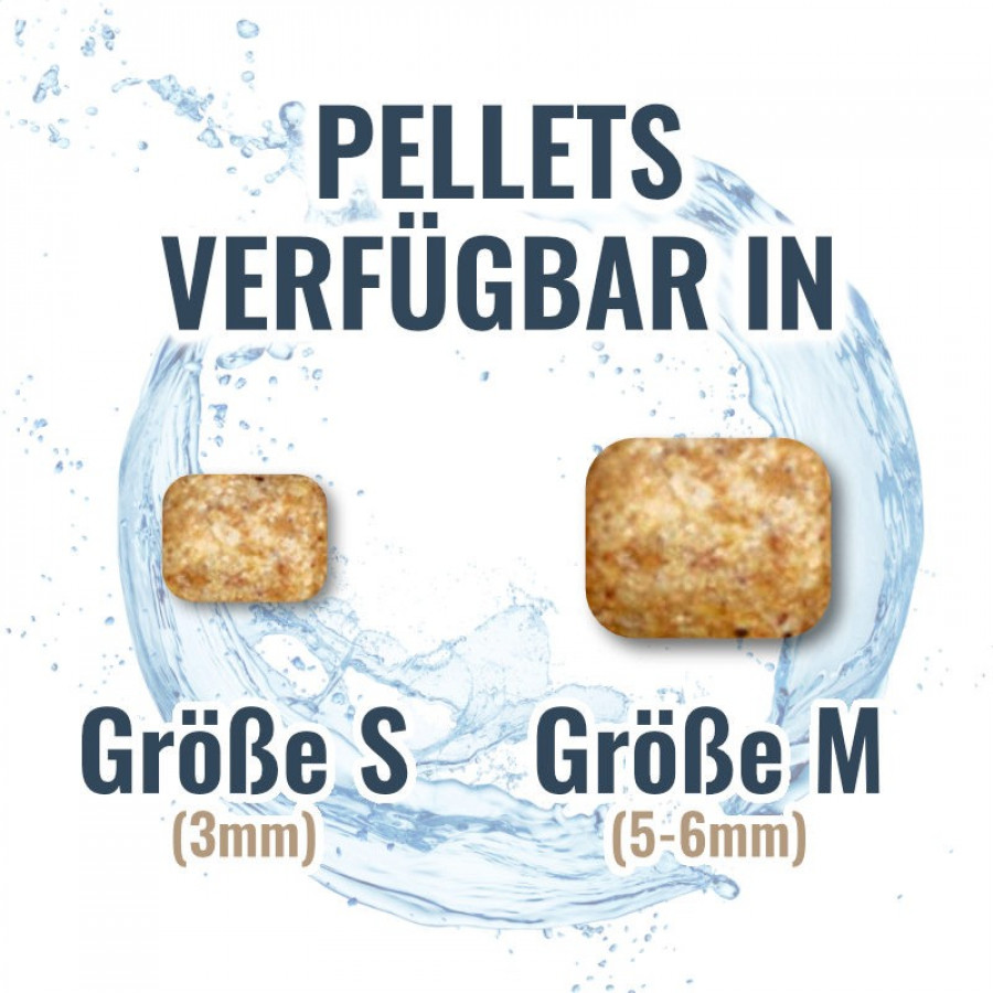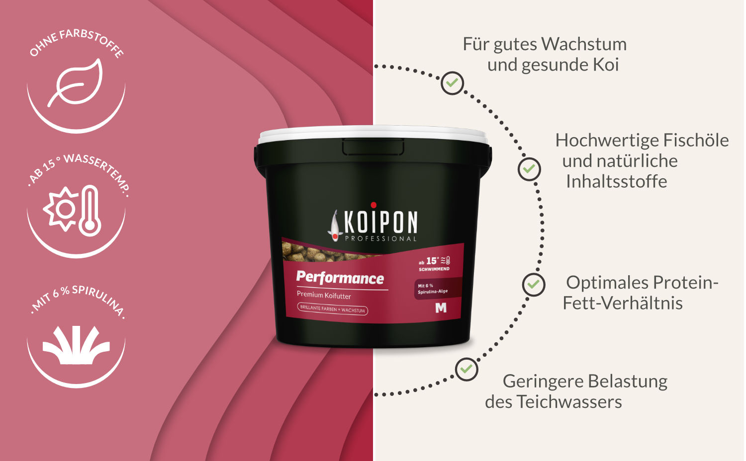 Ein hochwertiges Farbverstärkungsfutter für den Sommer in Pelletgröße M, mit einer hohen Konzentration an hochwertigsten Spirulina-Algen, die der Koi optimal in die Entwicklung der kräftigen Farbpigmentierung mit hohem Glanz umsetzen kann. Mit 90 % Verdaulichkeit sorgt Performance für weniger Ausscheidungen und sichtbar klareres Teichwasser. Ausgewogenes Protein-Fett-Verhältnis, welches dem Koi ermöglicht, seine Energie aus dem Fett zu ziehen und das Protein für den Muskelaufbau zu nutzen. Dadurch werden die Kiemen eindeutig weniger belastet, denn weniger Ammonium wird über die Kiemen abgegeben. Dieses fördert die Gesunderhaltung der Kiemen und der Koi. Der Filter und das ganze System werden mit weniger Schadstoffen belastet.