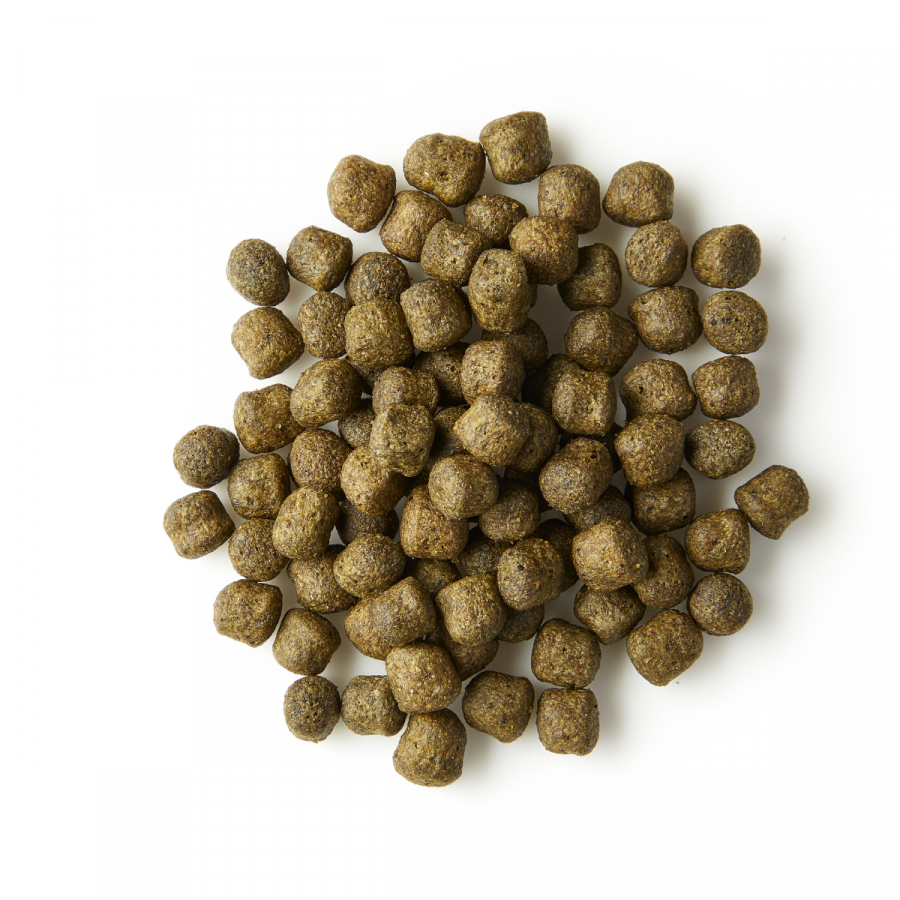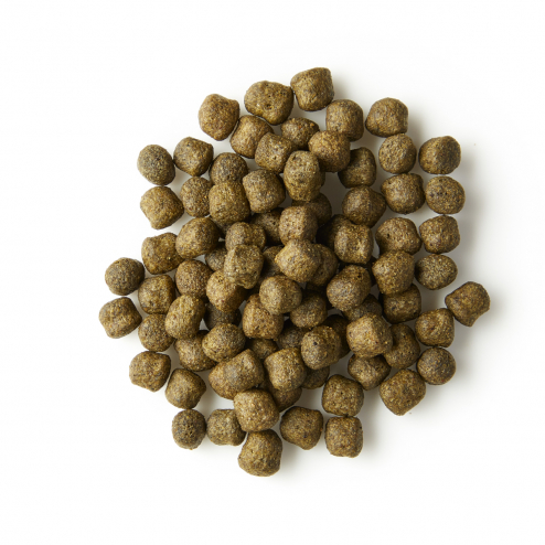 Zusammensetzung: 6 % Spirulina-Algen, Weizen, Rapsexpeller, Sojaschrot, Fischmehl, Fischöl, Erbsenprotein, Monocalciumphosphat.