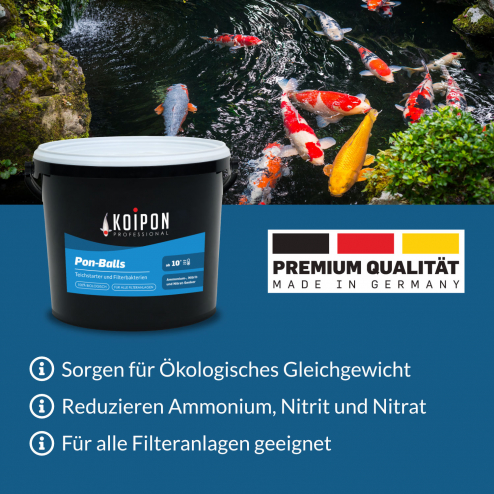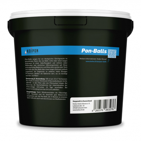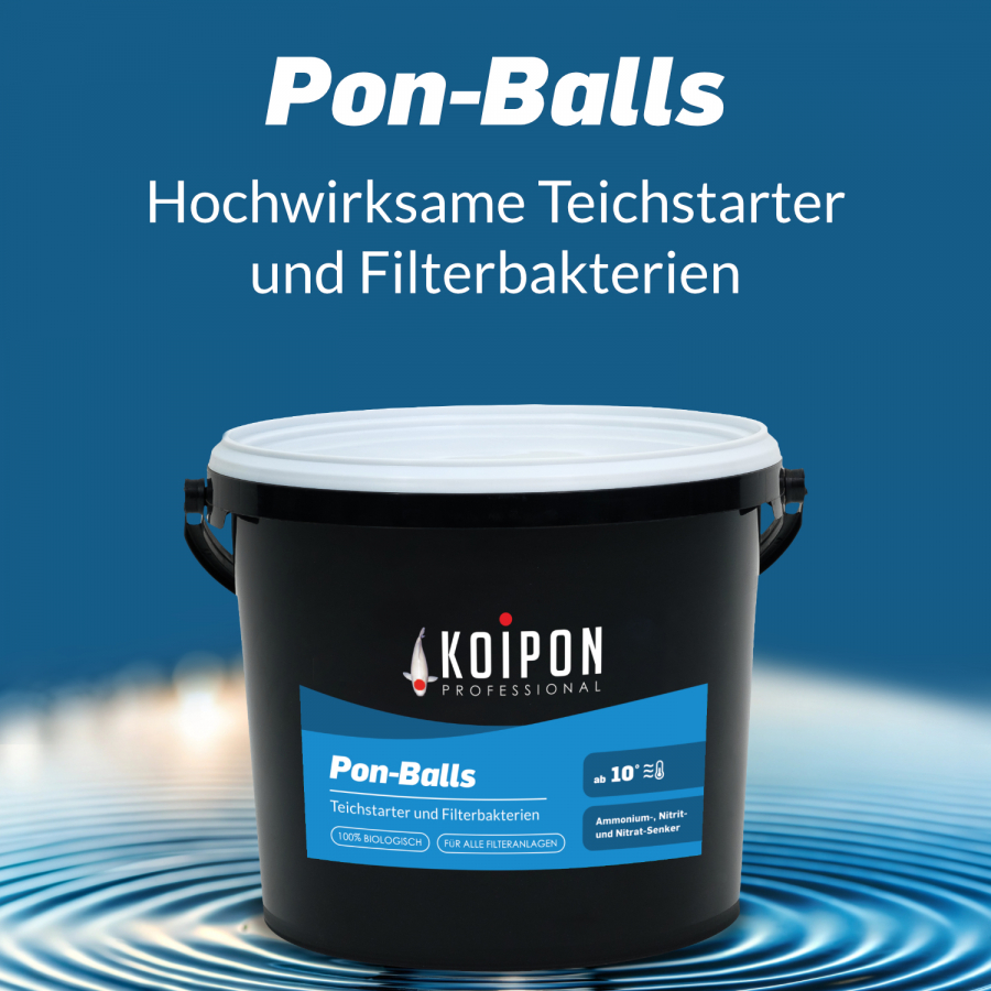 KOIPON Pon-Balls sorgen für ein ökologisches Gleichgewicht im künstlichen Teich. Die Gel-Bälle reifen über einen langen Zeitraum in einer Nährflüssigkeit und nehmen dabei Milliarden von nützlichen Mikroorganismen auf. Diese erforderlichen Bakterien und Mineralien werden dem Teich mit Hilfe der Pon-Balls über einen langen Zeitraum zyklisch zugeführt. Im Gegensatz zu anderen, meist flüssigen Produkten, bleiben die Bakterien dort, wo sie benötigt werden: im Filter!