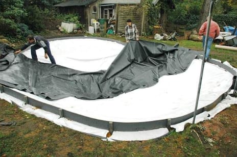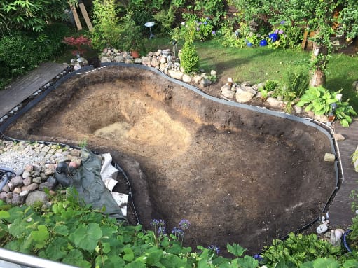 - Zunächst wird an der gewünschten Stelle des Gartens eine Grube ausgehoben und diese anschließend mit einer Folie ausgelegt – und abgedichtet.