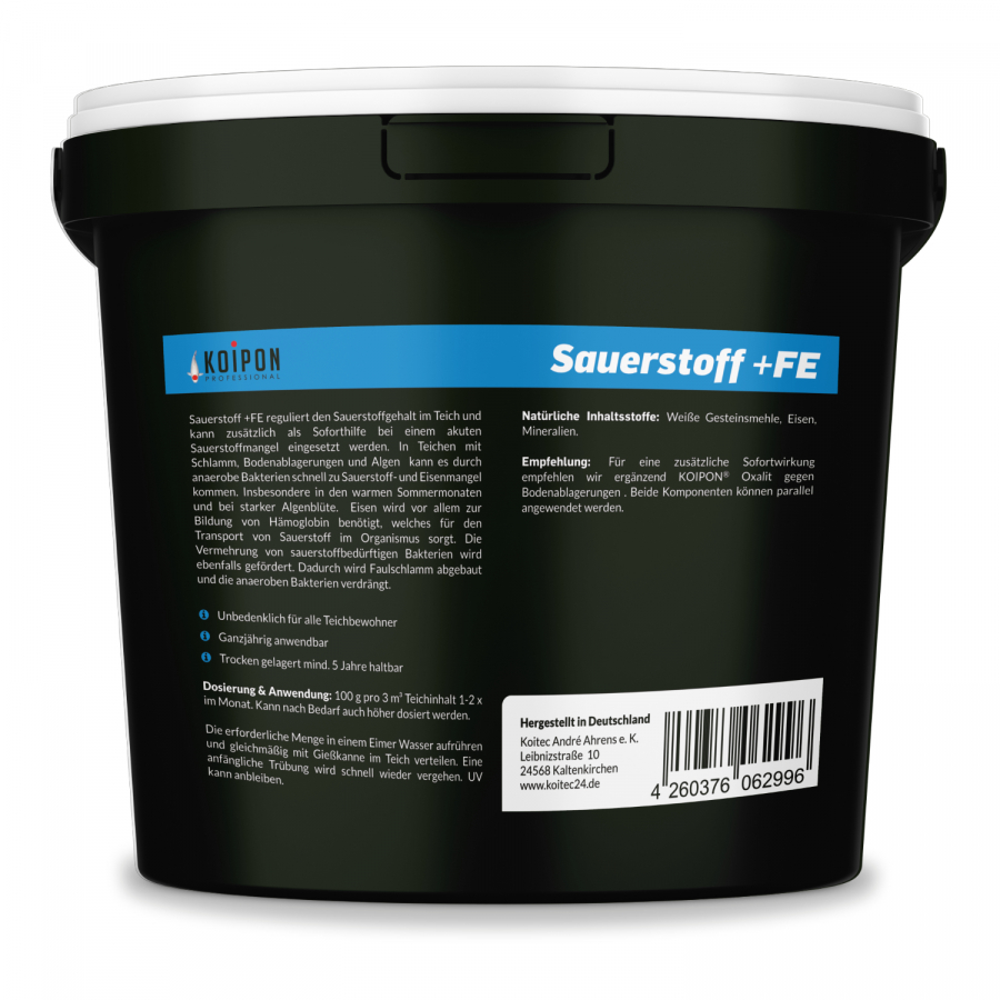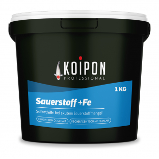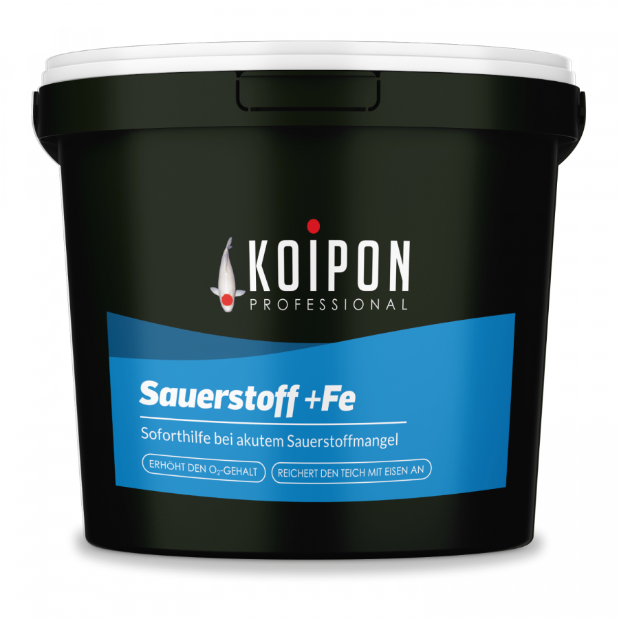In Teichen mit Schlamm, Bodenablagerungen und Algen kann es durch anaerobe Bakterien schnell zu einem Sauerstoff- und Eisenmangel kommen. Insbesondere in den Sommermonaten und bei starker Algenblüte. Sauerstoff +FE reguliert den Sauerstoffgehalt im Teich und kann zusätzlich als Soforthilfe bei einem akuten Sauerstoffmangel eingesetzt werden. Die Vermehrung von aeroben Bakterien wird gefördert. Dadurch wird Faulschlamm abgebaut und die anaeroben Bakterien verdrängt. Im Organismus der Koi fördert das enthaltene Eisen die Bildung von Hämoglobin und sorgt für einen optimalen Sauerstofftransport.