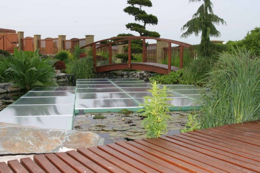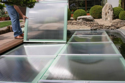 Die schwimmende Teichabdeckung aus Doppelstegplatten verfügt über zwei Luftkammern und ist aus hochwertigem, gesundheitsunschädlichem Makrolon® (Polycarbonat) gefertigt. Die Platten verhindern den Wärmeverlust im Winter und schenken Ihren Koi trotzdem ausreichend Tageslicht. Die Abdeckung von rund 80% sind bereits ausreichend, um die Temperatur zu halten. Ein weiterer Vorteil ist, dass durch die hohe Lichtdurchlässigkeit mit gleichzeitiger UV-Beständigkeit der Teich durch Sonnenlicht aufgeheizt werden kann. Auch Schneebelastung ist unbedenklich. Die Platten versinken nur minimal und sorgen durch die wärmeren Temperaturen im Teich für schnelles abtauen. Die Platten können einfach von einer Person auf den Teich gelegt und miteinander verankert werden.