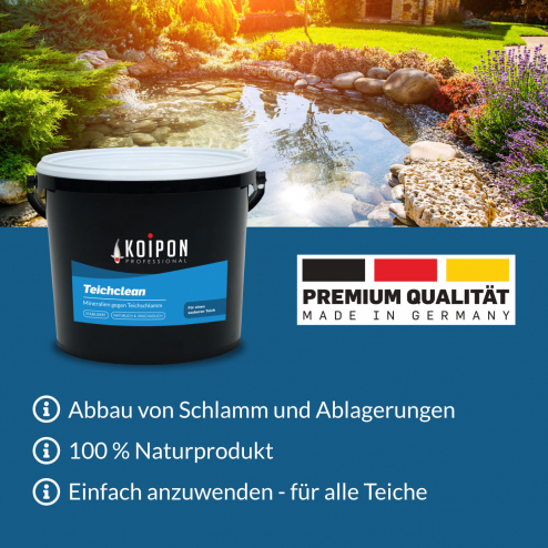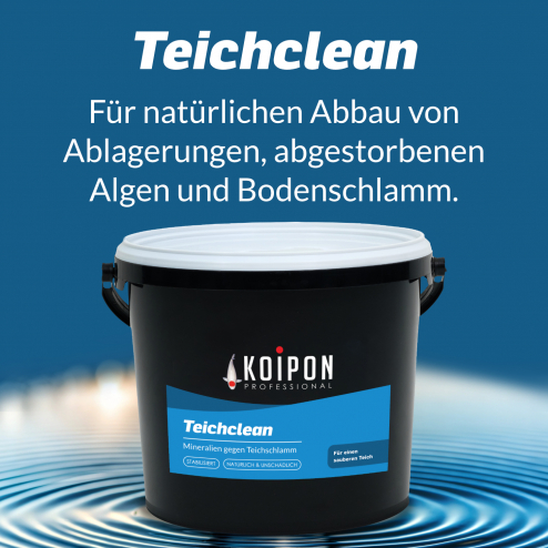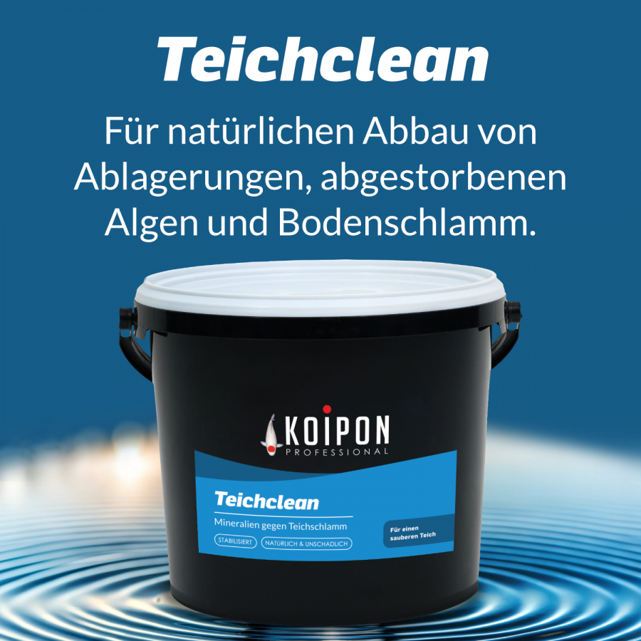 Der Teichschlammentferner Teichclean enthält eine Komposition aus wertvollen Mineralien, die den Aufbau von schlammabbauenden Mikroorganismen fördert. Hierdurch können Teichschlamm und abgestorbenen Algen innerhalb weniger Wochen effizient reduziert und abgebaut werden. Das sorgt für einen sauberen und stabilen Teich. Bei regelmäßiger monatlicher Anwendung im Frühling, Sommer, Herbst und Winter unterstützt die Mischung aus natürlichen Mineralien die biologische Selbstreinigungskraft und reduziert die Filterbelastung im Gartenteich - und ist dabei völlig unbedenklich für den Teich und seine Teichbewohner! Gleichzeitig stabilisieren sich die Teichhärte und der pH-Wert.
