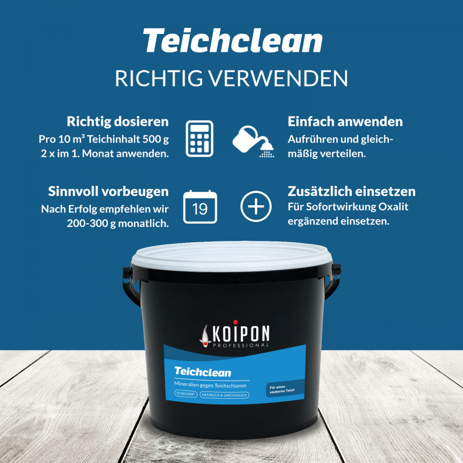 Empfehlung: Für eine zusätzliche Sofortwirkung empfehlen wir ergänzend unseren Teichreiniger Oxalit. Beide Komponenten können parallel angewendet werden.