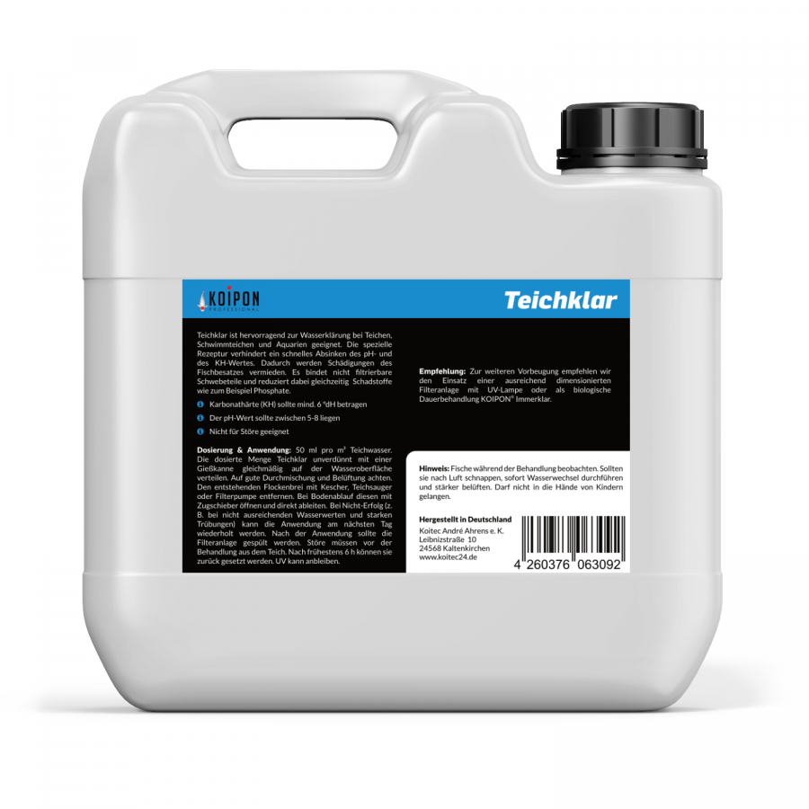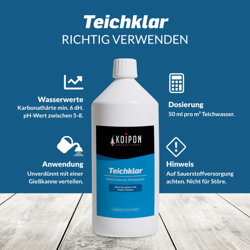 Um langfristig klares Teichwasser zu gewährleisten, setzen Sie neben KOIPON® Teichklar idealerweise auf eine gut dimensionierte Filteranlage mit UV-Lampe oder auf die biologische Dauerbehandlung mit KOIPON® Immerklar. So bleiben Ihr Teich und Ihre Fische dauerhaft gesund und klar.