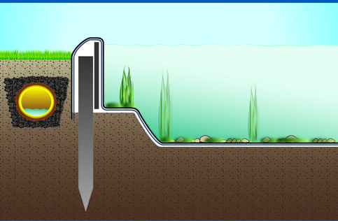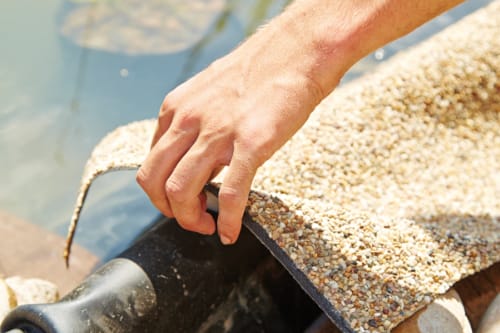 Das Teichrandsystem PondEdge eignet sich besonders gut zum Anlegen der Kapillarsperre. Achten Sie darauf, dass die Teichfolie ca. 60-80 cm über den Teichrand ragt. Beim Befüllen wird die Folie noch einige cm in den Teich gezogen. Stellen Sie die Saugsperre erst nach dem Befüllen des Teiches fertig. Böschungs- und Ufermatten sollten nicht in das umliegende Gelände ragen.