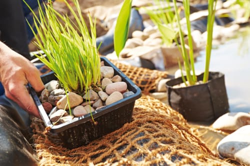 Zur Bepflanzung des Teichrands eigenen sich Böschungsmatten oder Böschungstaschen aus Kokos oder Jute. Sie geben Ihren Pflanzen auch auf großer Fläche sicheren halt und sehen dazu noch gut aus.